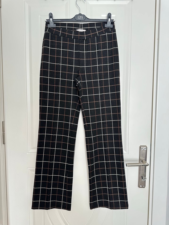 Kahverengi ekose desenli kumaş pantolon, normal kesim, pileli ve midi boyda, ofis ve günlük kombinlere uygun. Yüksek bel yurtdışı marka 34 beden fakat 36 bedene olur kalıbı esnek