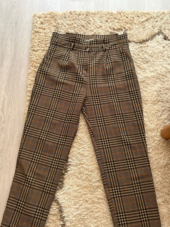 Kahverengi kareli kumaştan, belinde tokalı, midi boy regular fit kadın pantolon. Rahat ve günlük kullanıma uygun.hiçbir kusuru yok. Sadece bir kez giyildi. İhtiyaç fazlası ve dar geldiği için satıyorum. Bedeni 44. Bel ölçüsü 41 cm, uzunluk 100 cm, paça ölçüsü 19 cm.