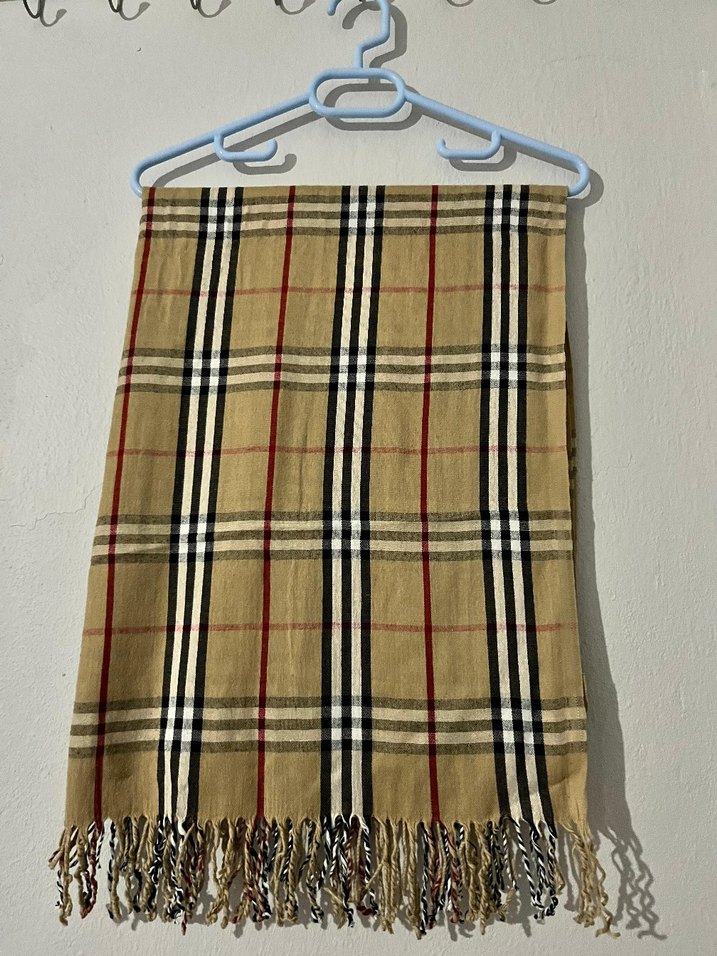 Hafif kahverengi, püsküllü ve dökümlü tasarıma sahip kadın şalı. Yumuşak tekstil kumaştan, rahat sokak stili ekose desenli.
