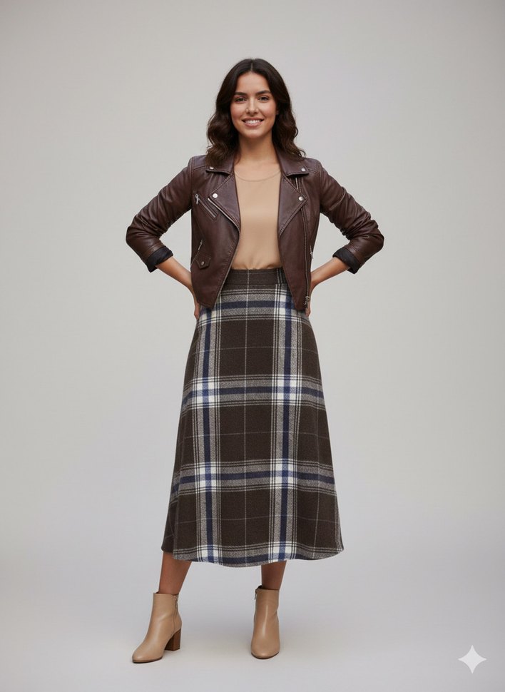 Kahverengi ve gri ekose desenli midi etek. Günlük kullanıma ve sokak stiline uygun rahat kesimle tasarlanmıştır.