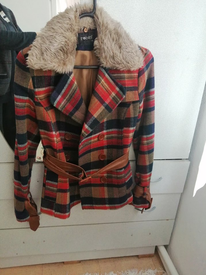 Kahverengi tonlarda ekose desenli, kısa kadın kaban. İyi durumda.