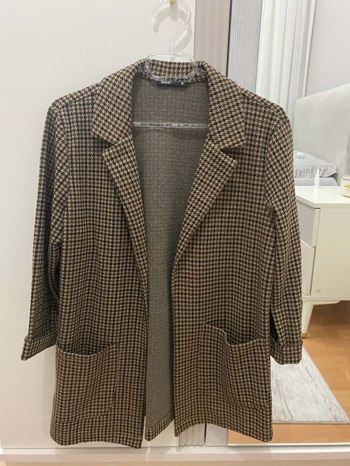 Kahverengi ekose desen , kesik yaka Normal kalıp, midi boy ve iki cep bulunur. 38 beden 40 bedenede uyar esnek kumaş astarsız kolu yarım 3 kere giyildi Defactonun ürünü