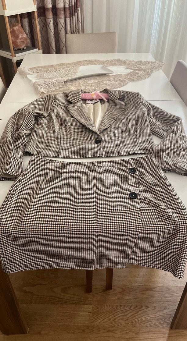 Kahverengi Ekose Midi Ceket ve Etek Takım