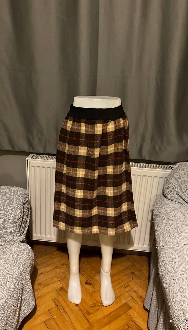 Kahverengi midi hamile eteği, yumuşak yün kumaştan, bol kesim ve pileli tasarıma sahiptir. Günlük kullanıma uygun rahat sokak stili sunar.