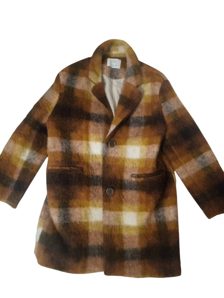 Kahverengi yün kaban, kürk detaylı, kesik yaka ve koyu ekose desenlidir. Normal kesim, uzun kollu ve midi boydadır, günlük kullanıma uygundur.