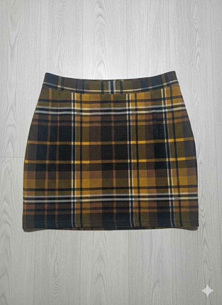Kahverengi ekose desene sahip, sentetik kumaştan yapılmış dar kesim mini etek.