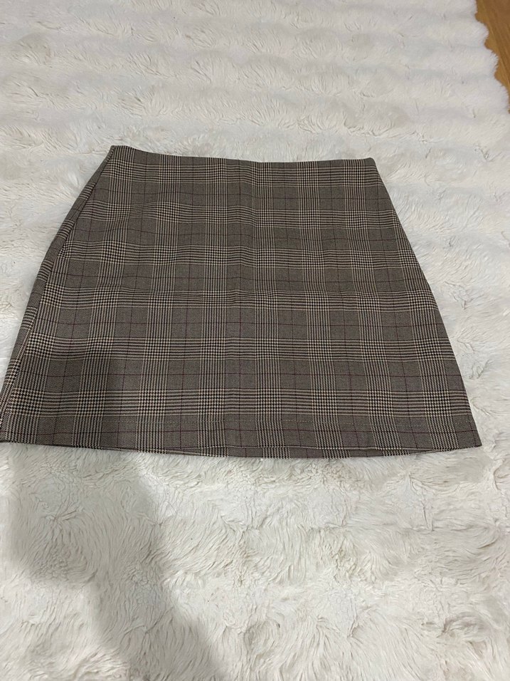 Kahverengi ekose desenli, sentetik kumaştan yapılmış, kürk detaylı, normal uzunlukta ve rahat kesim mini etek. Ofis için uygundur.