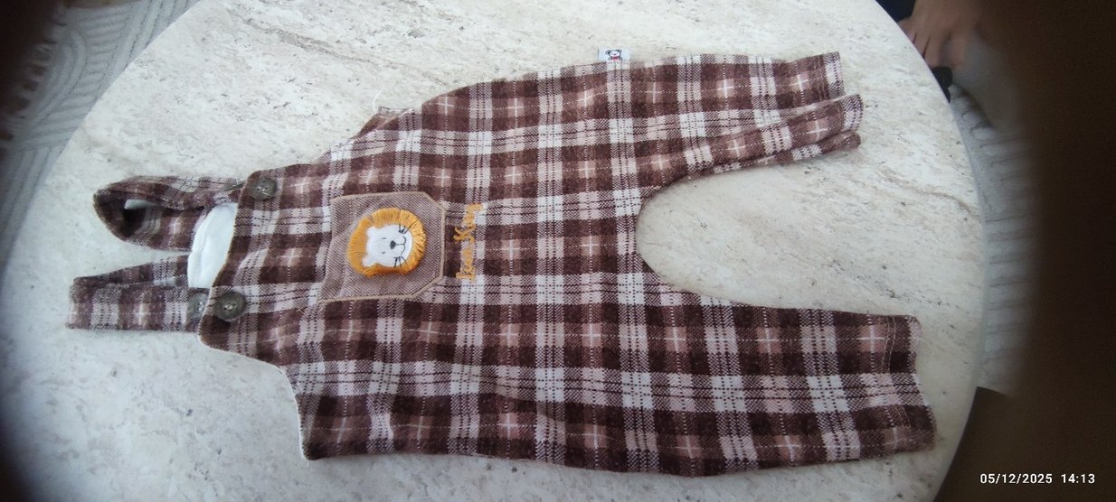 Kahverengi ekose desenli, nakışlı aslan figürlü yumuşak kumaştan bebek önlüğü. Gri tonlar içerir ve rahat bir tasarıma sahiptir.