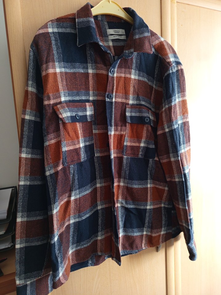 Bu erkek yün gömlek, bol kesim ve düğmeli ön kısmıyla uzun kolludur. Notlu yakalı ve koyu kahverengi ekose desenlidir.