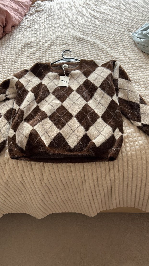 Kahverengi ekose desenli, uzun kollu ve yuvarlak yakalı örgü kazak. Salaş kesimi ve normal midi boyu ile günlük sokak stiline uygun.