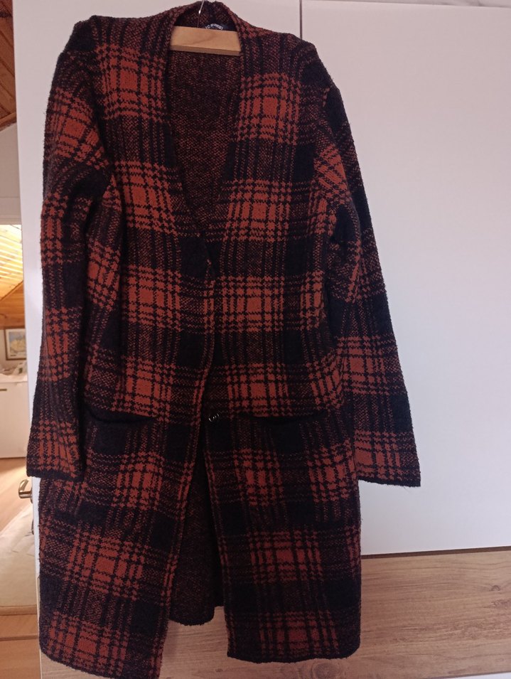 Kadınlar için uzun, örgü dokulu yün kaban. Koyu kahverengi ekose deseni, bol kesim ve yaka detayına sahiptir. Günlük kullanıma uygundur.