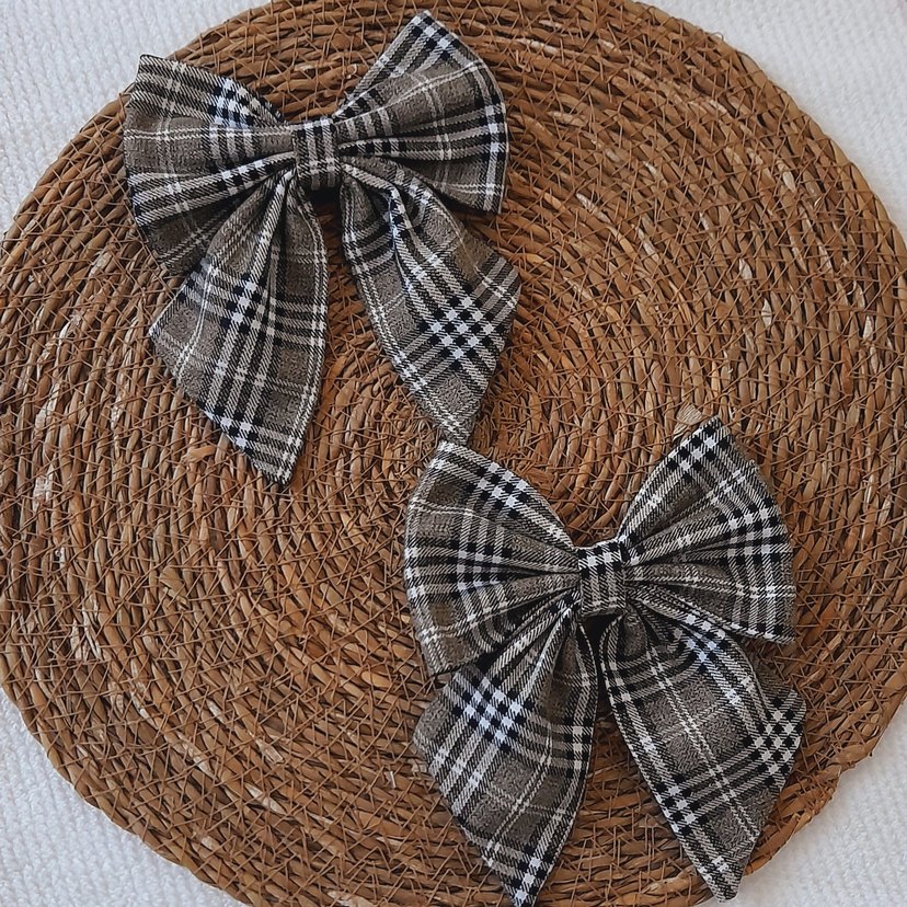 Kahverengi ekose desenli örgü kumaştan yapılmış, bohem tarzda Paris esintili saç aksesuarı fiyonklar .