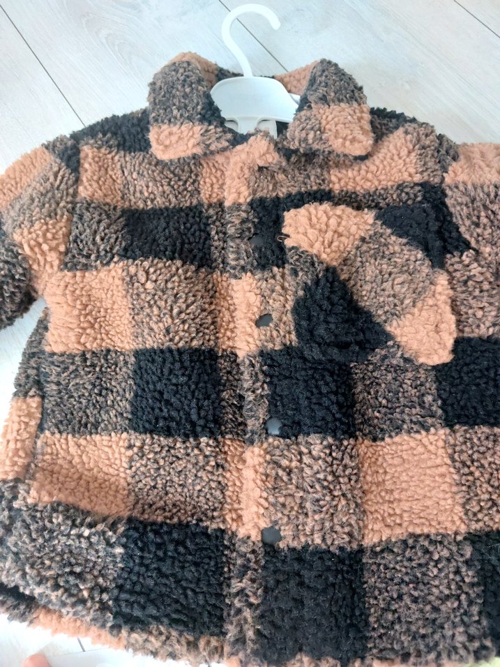 Gevşek kesim, kesik yaka ve koyu kahverengi ekose desenli erkek çocuk kabanı. Yumuşak, sıcak peluş kumaştan, kürk detaylı sokak stili.