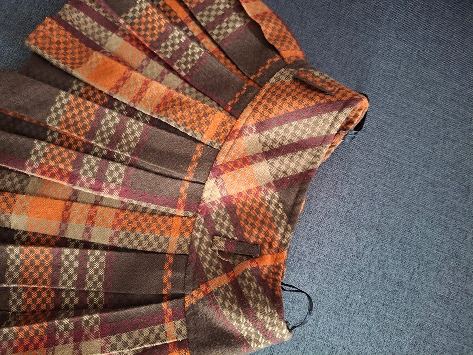 Kahverengi ekose desenli, pileli ve bol kesim midi etek, vintage ve karşı kültür stilini günlük kullanıma uygun şekilde birleştirir.