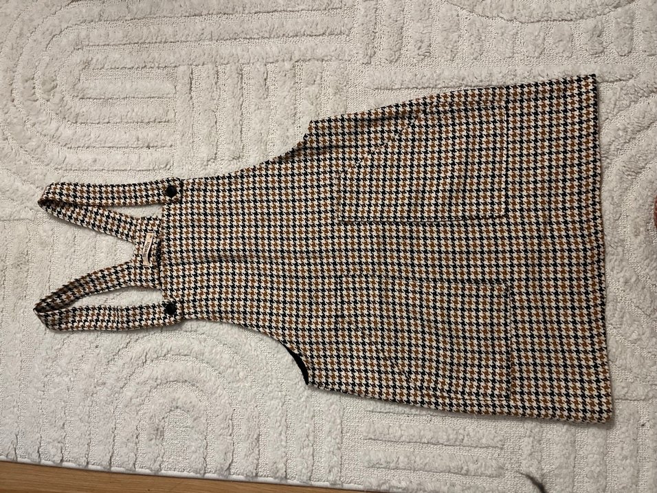 kahverengi ekose desenli sokak tarzı slopet kıyafeti. Kumaşı yumuşak dokuludur ve kahve tonlar içerir