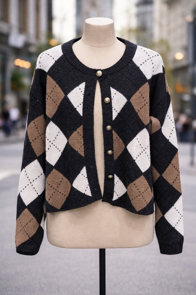 Bu kadın hırka, yuvarlak yaka ve uzun kollu, bol kesimlidir. Kahverengi, siyah ve beyaz renklerde ekose desenli, günlük kullanıma uygun triko dokumaya sahiptir.