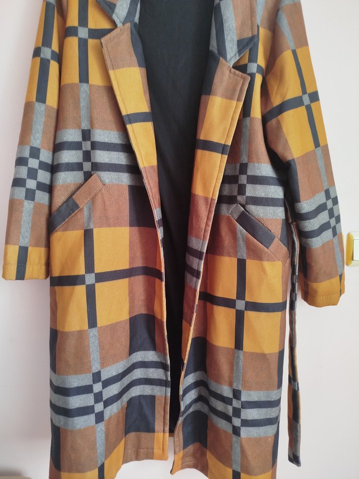Kahverengi ekose desenli, uzun ve kemerli kadın kabanı. Notlu yaka ve uzun kollu, sentetik kumaştan, rahat kesim.