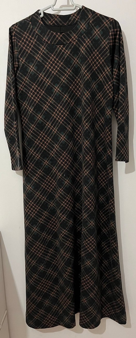 Kahverengi uzun kollu kadın elbisesi, ekose desenli ve tekne yaka detaylıdır. Yumuşak sentetik kumaştan üretilmiş olup, rahat bir normal kesime sahiptir.