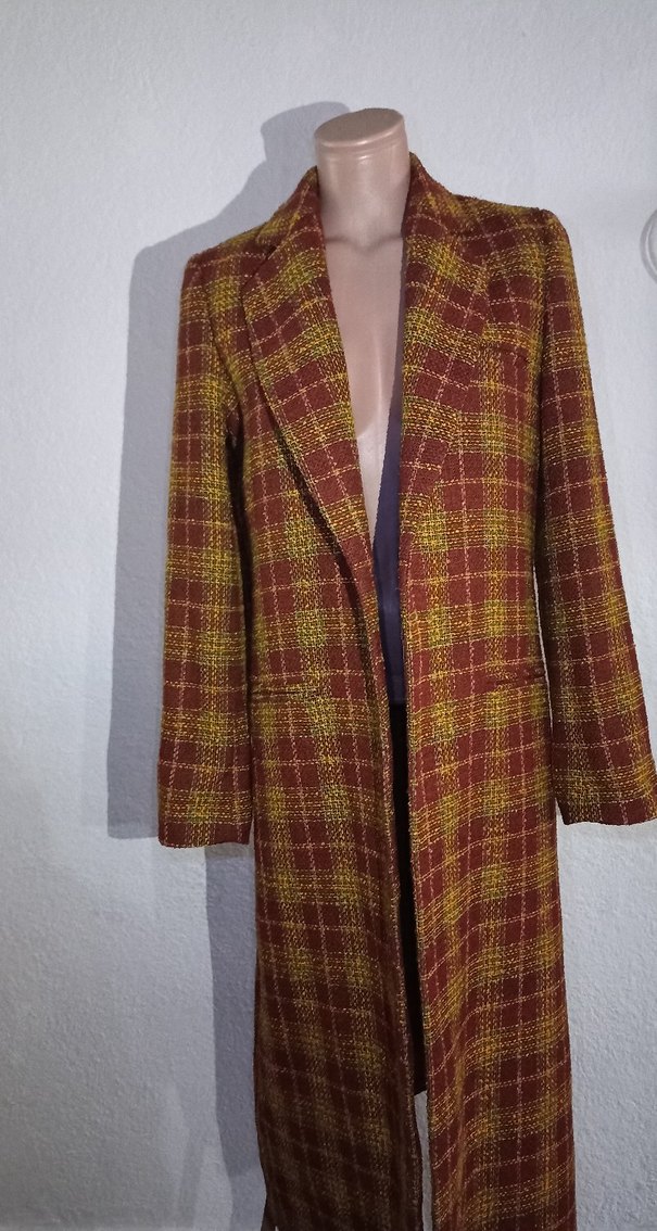 Kahverengi ekose desenli uzun yün kaban, notched lapel yakalı ve düğmeli tasarıma sahip. Uzun kollu ve regular fit yapısıyla ofis için uygundur.