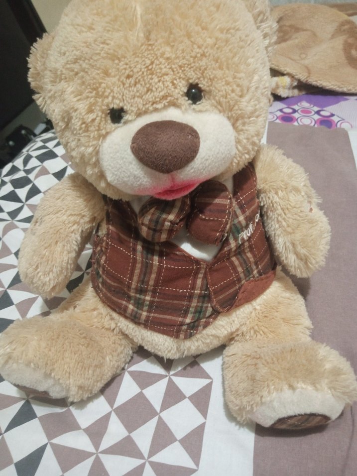 Yumuşak kahverengi peluş ayıcık, renkli ekose yelek giymiş, sarılmak için ideal .