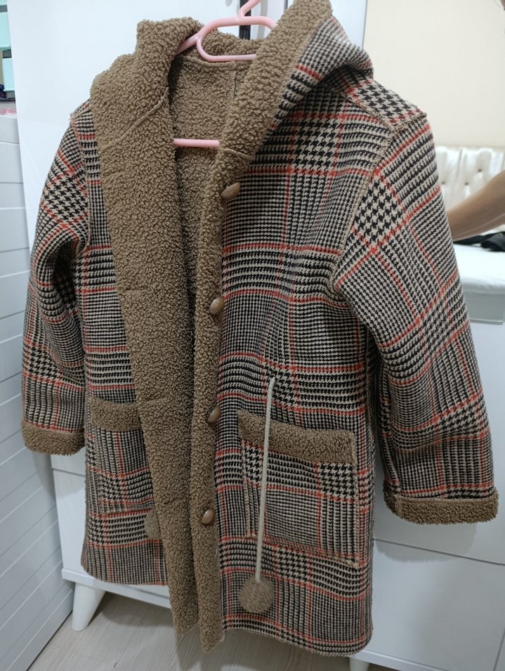 Kahverengi ekoseli, uzun kollu kadın midi kaban. Kürklü yumuşak fleece astarı ve kesik yaka detayıyla sıcak tutar. Rahat kalıp, günlük kullanım için uygundur.