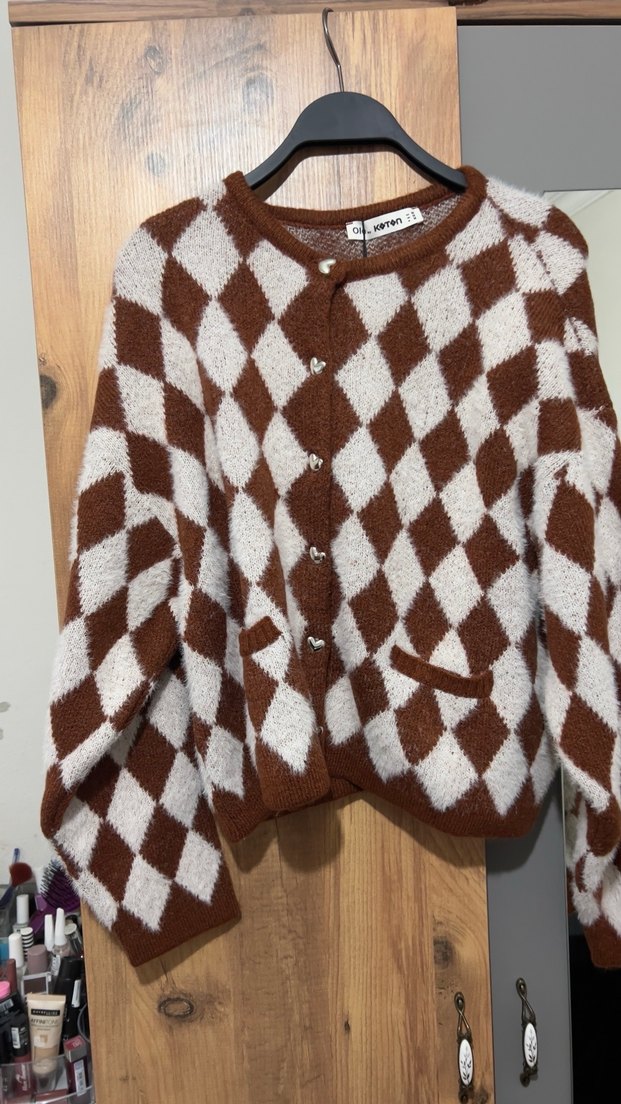 Kahverengi Ekoseli Örgü Kadın Hırka
