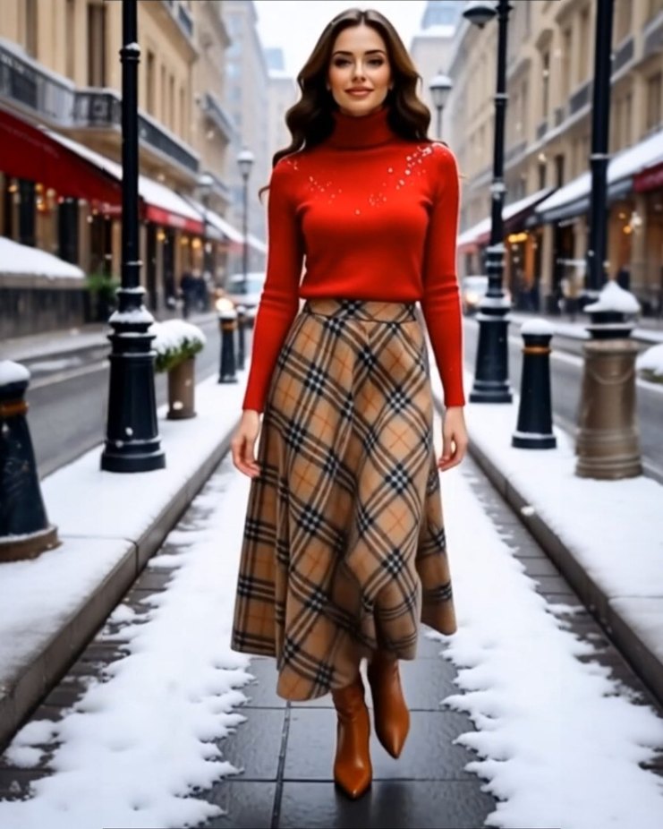 Kahverengi ekoseli, triko kumaştan yapılmış, parlak dokulu, bol kesim midi etek. Günlük rahat kullanım için uygundur.