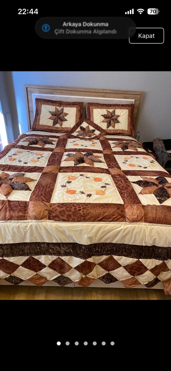 Koyu kahverengi yatak örtüsü, geometrik ve çiçek desenli nakışlarla süslenmiştir. Yatağa sıcak ve dokulu bir görünüm kazandırır. ️ Genişlik 2.42 Uzunluk 2.70