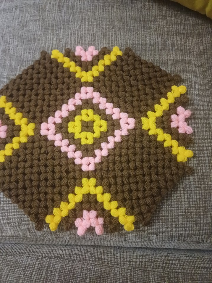 Kahverengi el örgüsü banyo lifi, sarı ve pembe desenlerle dokulu bir yüzey sunar.