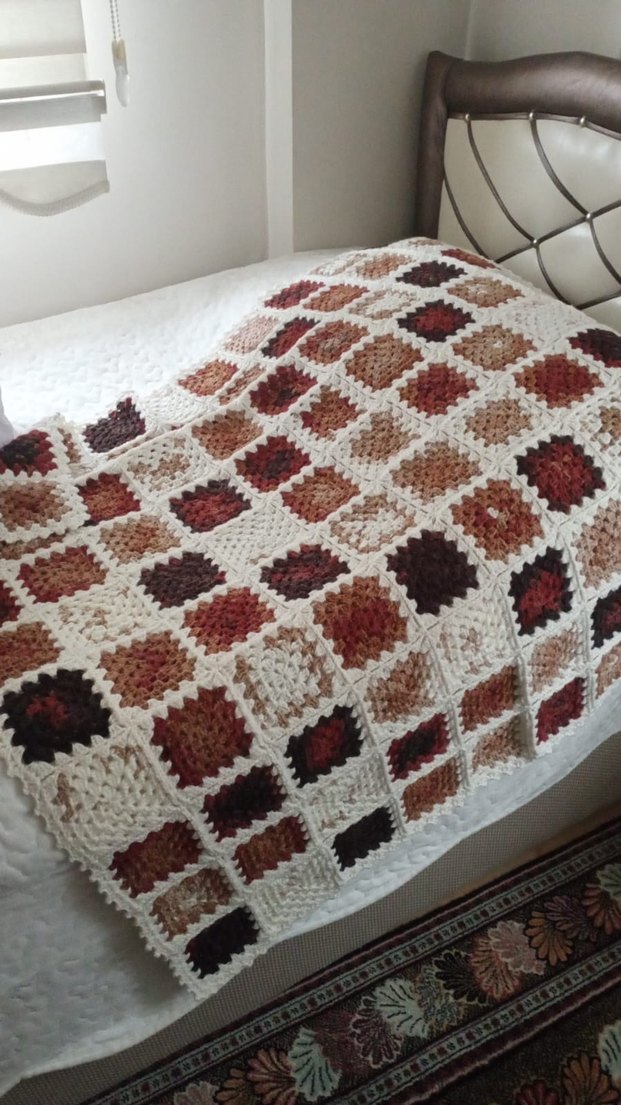 Koyu kahverengi tonlarında kare desenli el örgüsü battaniye, sıcak ve rahat bir doku sunar.