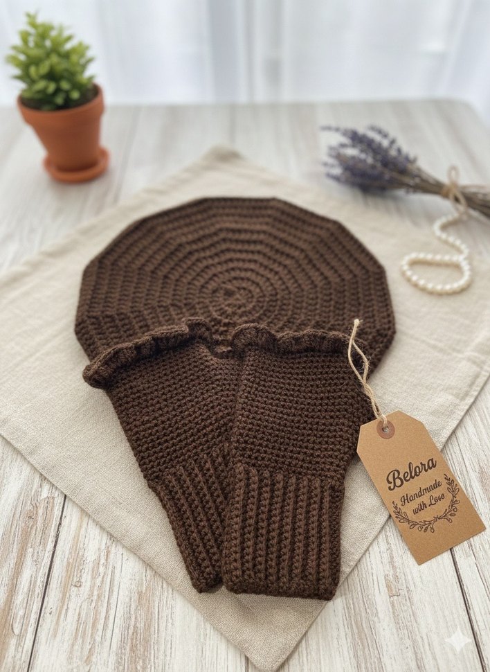 El örgüsü fırfır detaylı parmaksız eldiven ve bere set