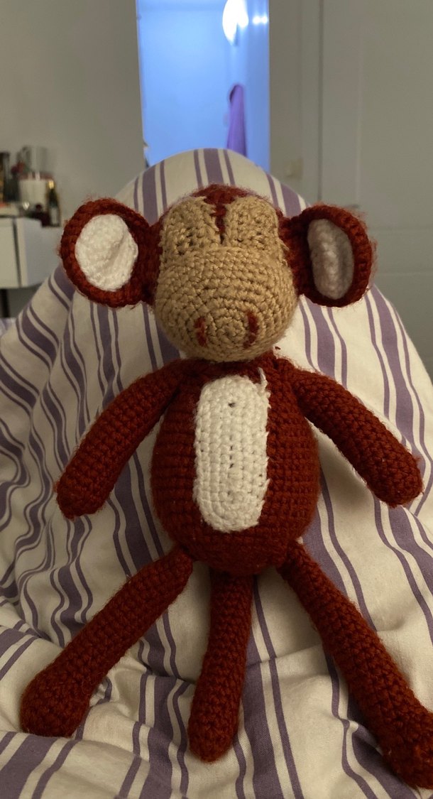 Koyu kahverengi tonlarda, el örgüsü maymun peluş oyuncak. Kulak ve karın kısmında detaylı dikişler bulunur.