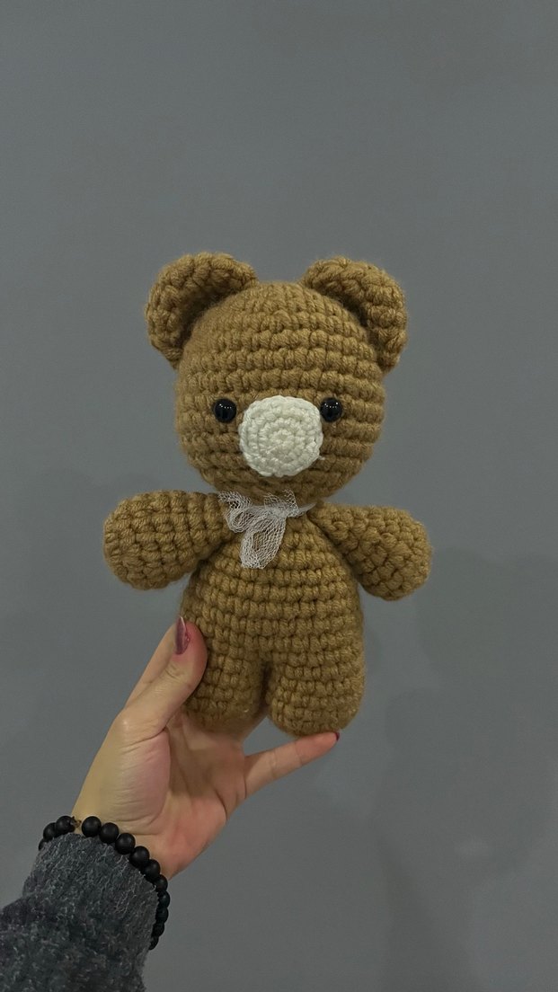 Yumuşak dokulu kahverengi el örgüsü peluş ayıcık, boynunda küçük dantel fiyonk ile süslenmiştir.