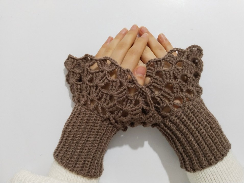 Kahverengi El Örgüsü Yarım Parmak Eldiven