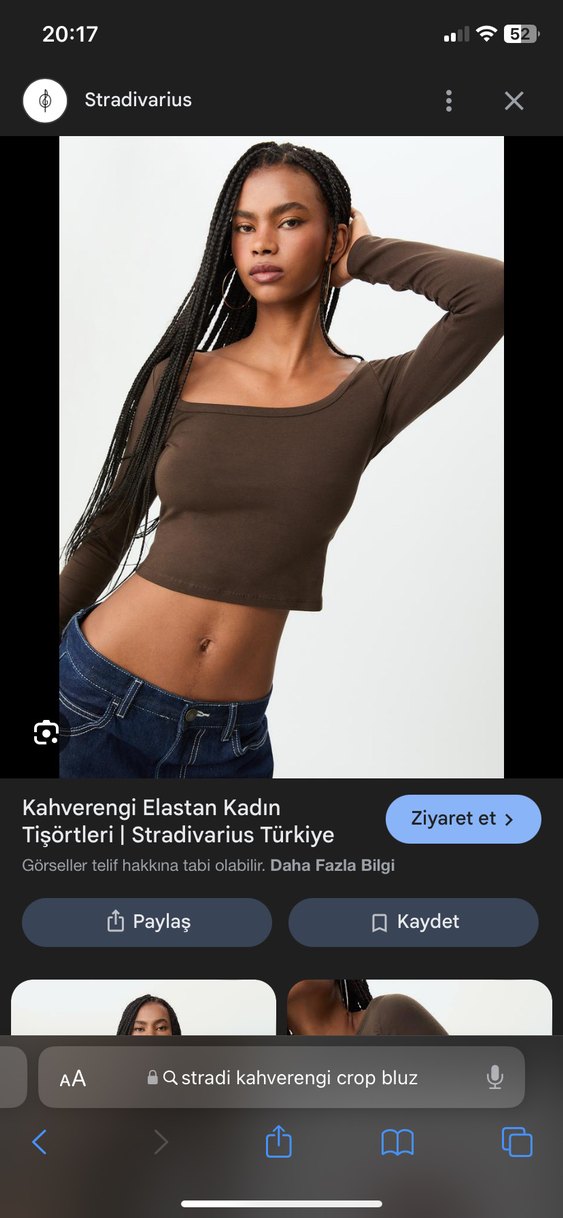 Bu kahverengi elastan bluz, tek renk, tekne yaka ve uzun kolludur. Günlük sokak stiline uygundur.