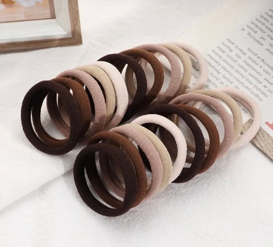 Çocuklar için çeşitli kahverengi ve bej tonlarında yumuşak elastik saç tokaları. Desensiz ve günlük kullanıma uygun.