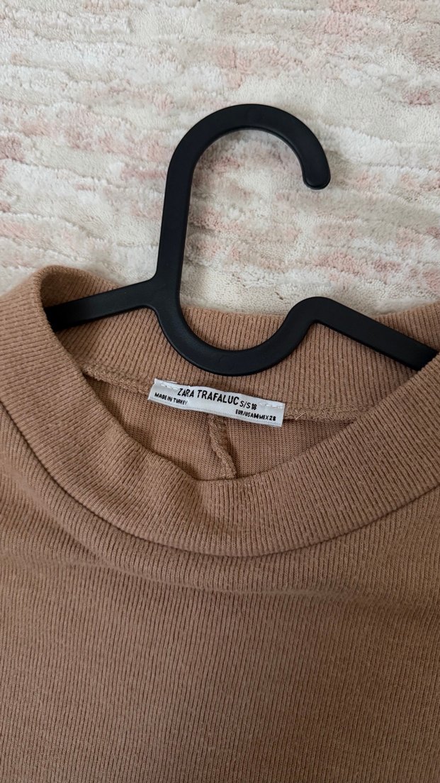 Kahverengi, yuvarlak yaka ve yumuşak dokulu elbise bol kesim