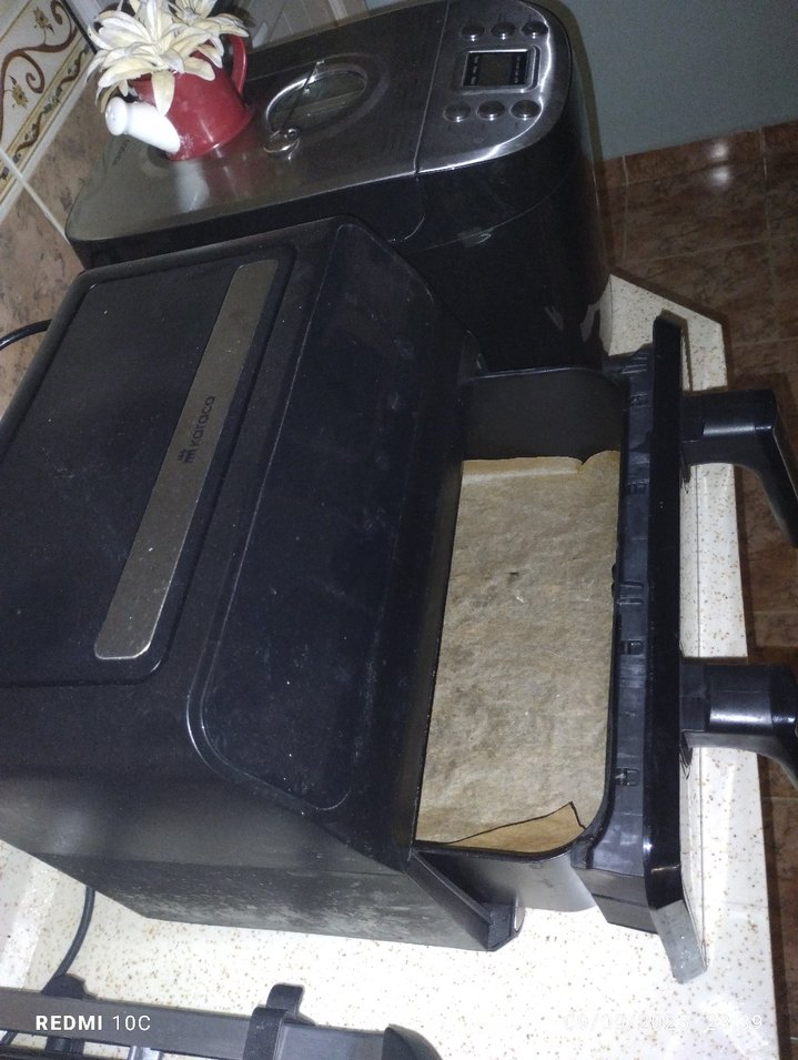 Kahverengi elektrikli ızgara ve fritöz, çıkarılabilir tepsi ve dijital kontrol paneli ile kolay kullanım sağlar.