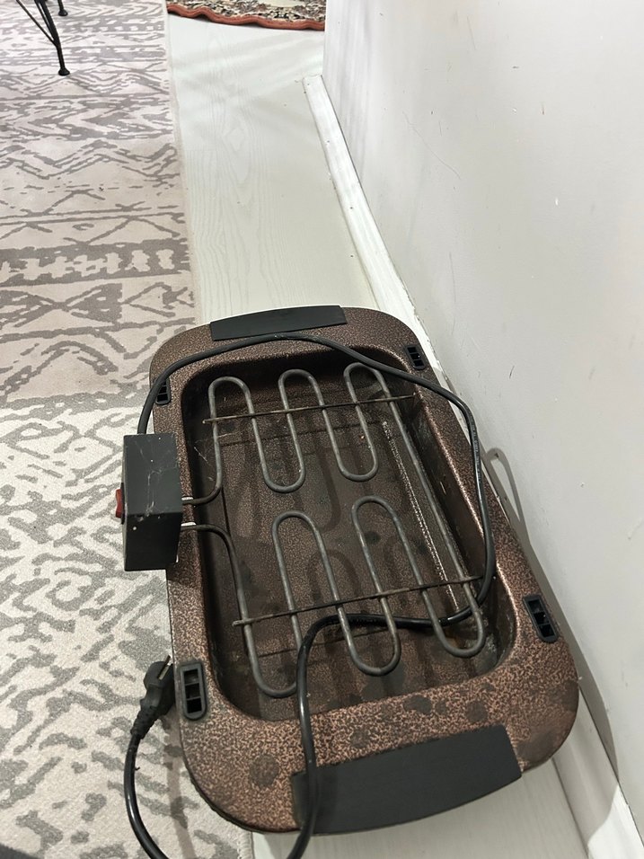 Kahverengi elektrikli ızgara, ısıtıcı eleman ve çıkarılabilir ızgara rafına sahiptir. Taşıma kulpları ve elektrik bağlantı kablosu bulunur.