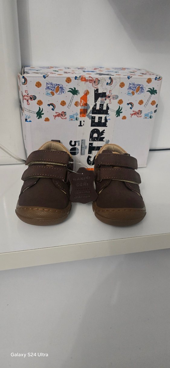 Kahverengi deri erkek bebek ilk adım ayakkabısı, cırt cırtlı, sade ve desen içermeyen sokak stili tasarım.