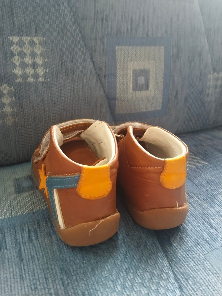 Parlak kahverengi, bantlı erkek bebek ilk adım ayakkabısı. Kauçuk malzemeden, trend sokak stiliyle uyumlu. ortopedik