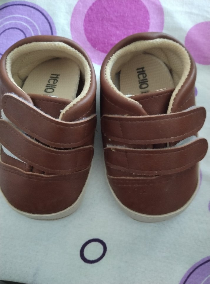 Parlak kahverengi, cırt cırtlı erkek bebek ilk adım ayakkabısı, yumuşak kauçuk malzemeden üretilmiştir. İç kısmında 'Hello' yazısı bulunur.