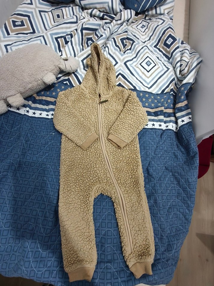 Yumuşak ve sıcak kumaştan kahverengi örme kapüşonlu erkek bebek tulumu. Önde fermuar ve rahat ribana manşetler bulunur. ❄️
