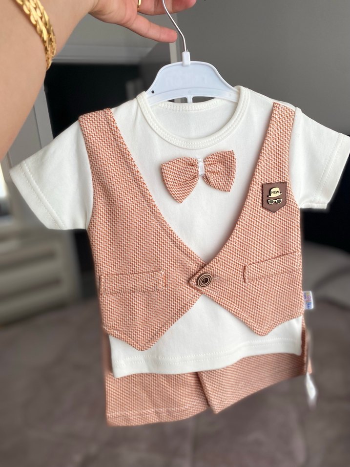 Kısa kollu, pamuklu kumaştan, düğmeli kahverengi baskılı yelek ve şortlu erkek bebek takımı. Fiyonklu detayla sokak stili görünümü sağlar.
