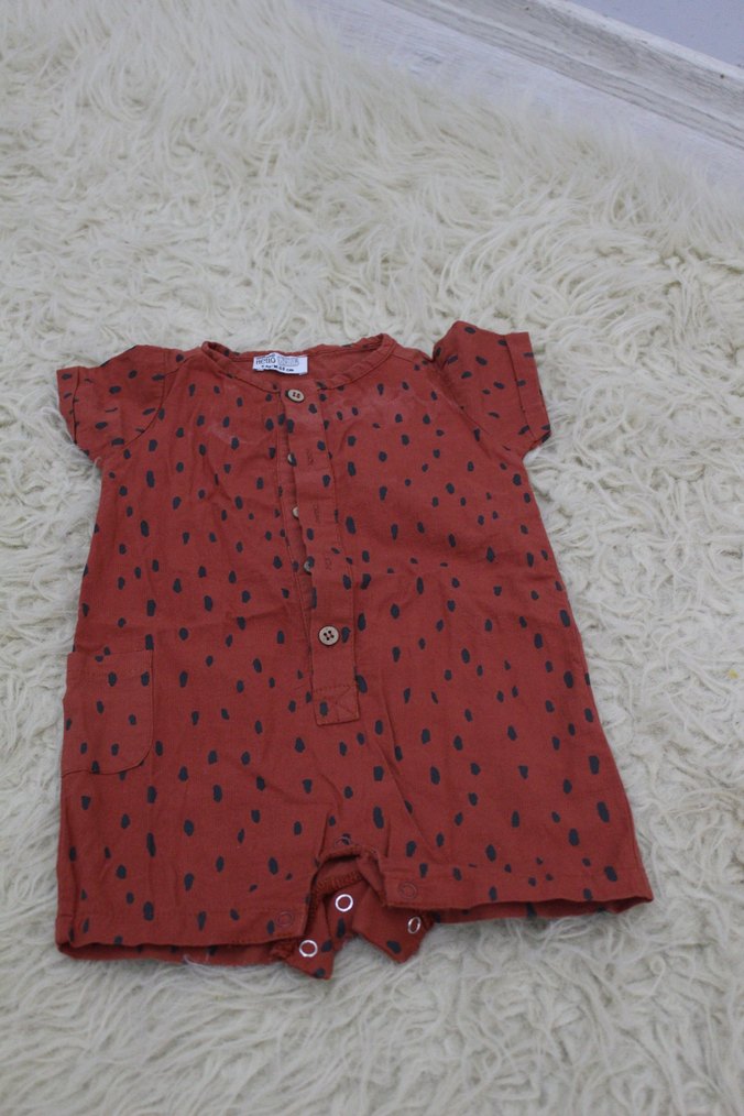 Kısa kollu, düğmeli ve bağlama desenli kahverengi erkek bebek tulumu, yumuşak sentetik kumaştan, sokak tarzında.