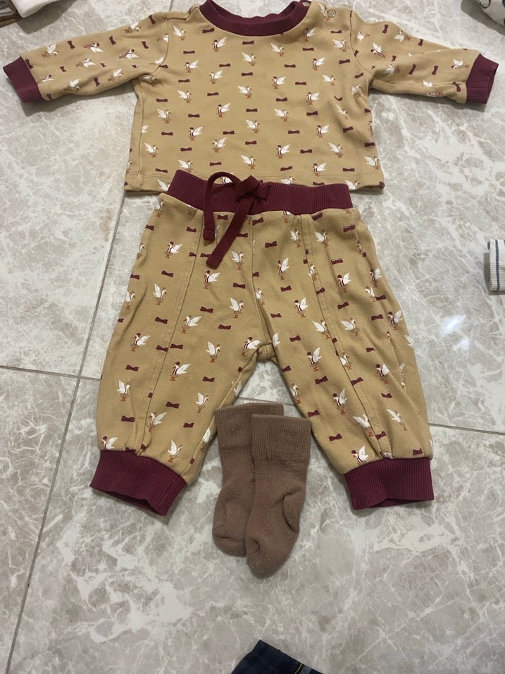 Uzun kollu, bisiklet yaka, kahverengi triko erkek bebek takımı. Yumuşak ve sıcak kumaş, desenli ve eşleşen çoraplı. BG baby marka