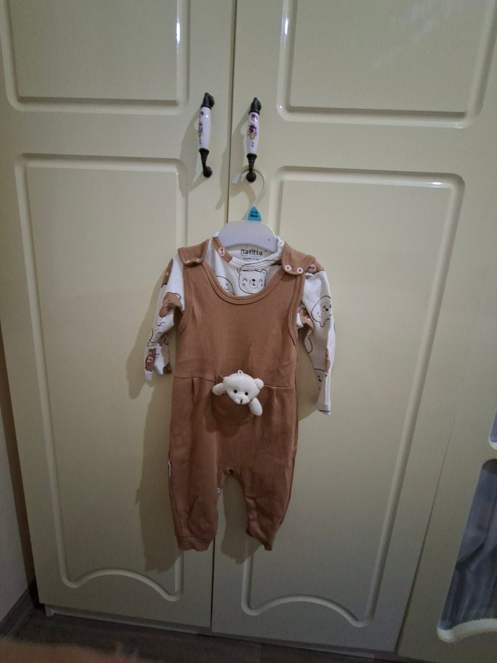 Uzun kollu, bisiklet yaka, kahverengi örme kumaştan yapılmış, yumuşak erkek bebek tulumu.