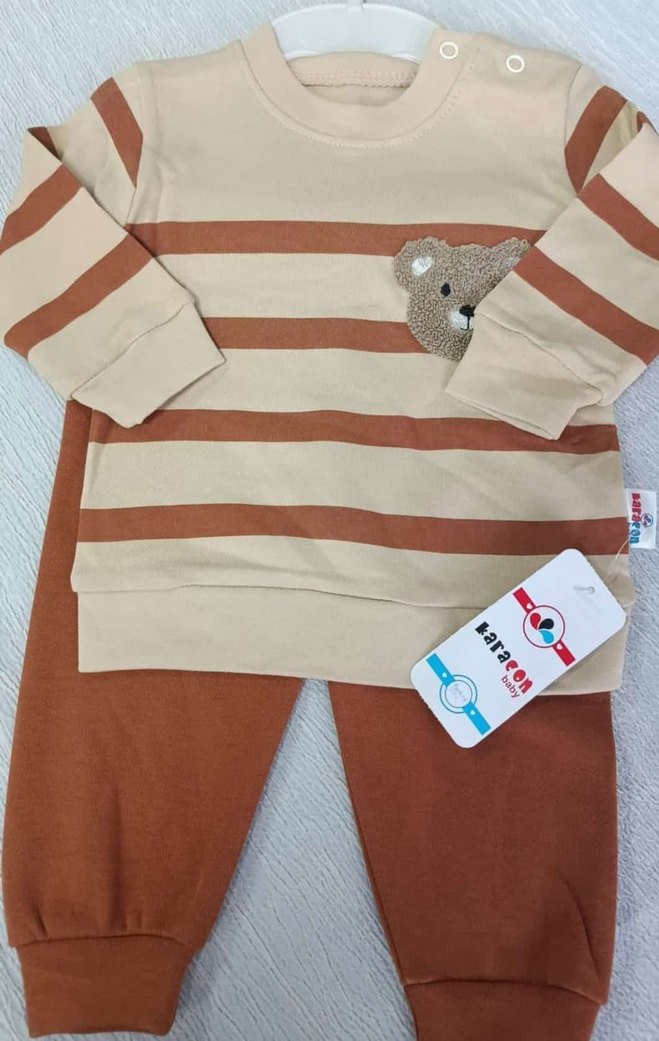 Açık kahverengi, uzun kollu ve bisiklet yaka bebek erkek takımı. Çizgili desen ve örme ayı detayı bulunur. Yumuşak ve sıcak kumaş.