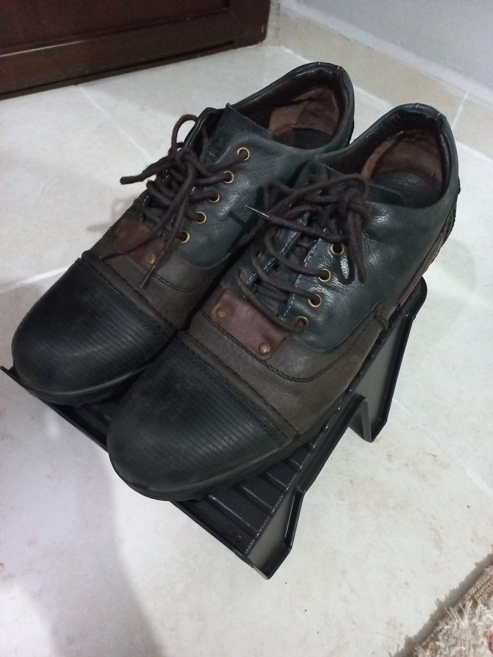 Koyu kahverengi erkek biker ayakkabılar kauçuk tabanlı ve tokalı detaylara sahip, grunge punk tarzını yansıtır.