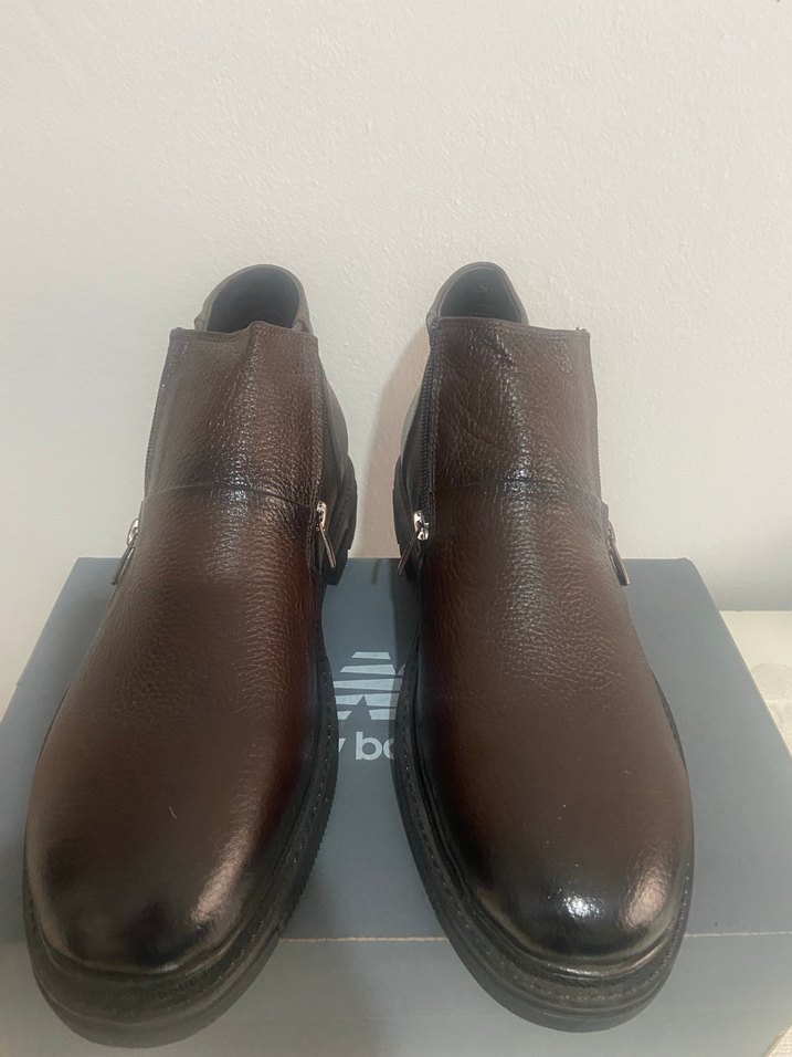 Ofis ve iş ortamına uygun, koyu kahverengi deri erkek botları klasik biker tarzında. Sıfır, giyilmemiş üründür.